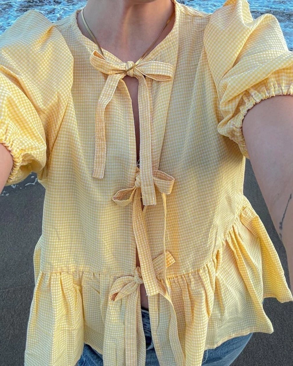 Blusa de cuadrillé de algodón con lazos frontales y mangas abullonadas. De corte suelto y liviano, combina un aire romántico con la frescura ideal para los días de verano